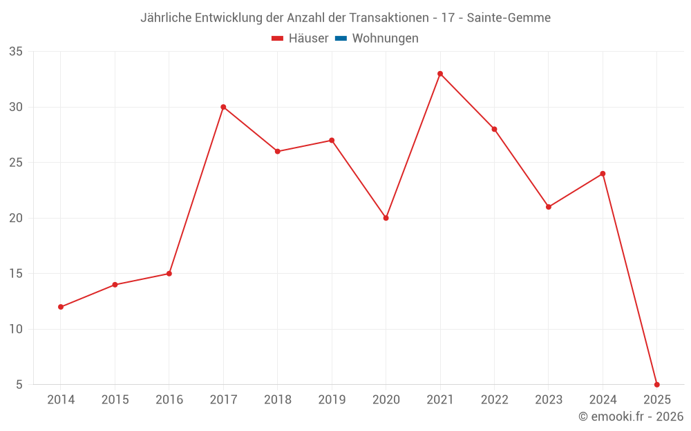 Der Durchschnittspreis auf den 17 Hausgeschäften der letzten 12 Monate in der Gemeinde Sainte-Gemme betrug 1 553 € pro Quadratmeter für einen mittleren Immobilienwert von 150 000 €. Über diesen Zeitraum hinweg lagen 60% der Transaktionen zwischen 1 116 und 2 261 € pro Quadratmeter (vom 2. bis zum 8. Dezil).
