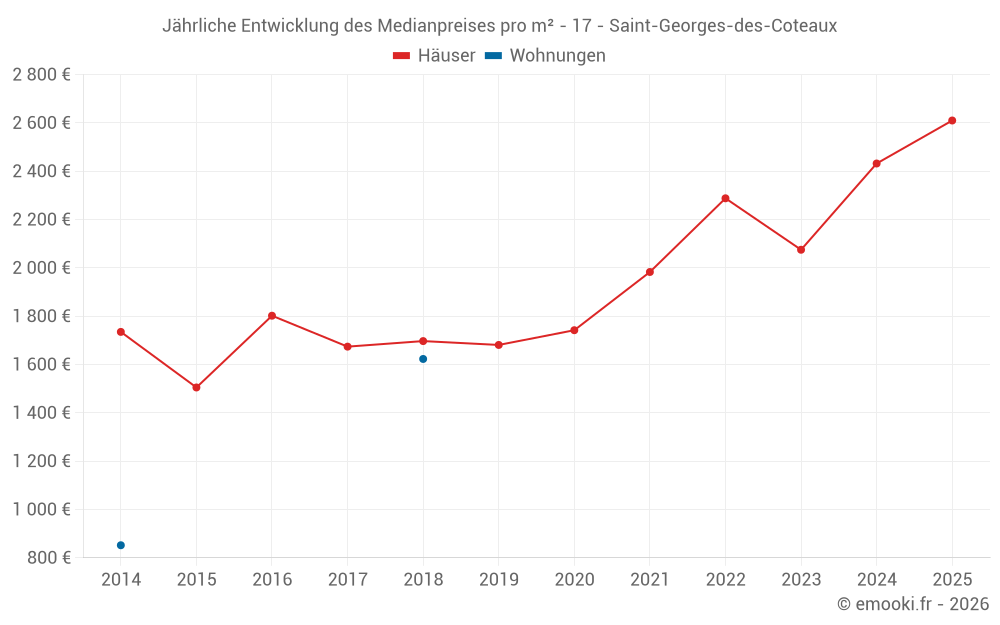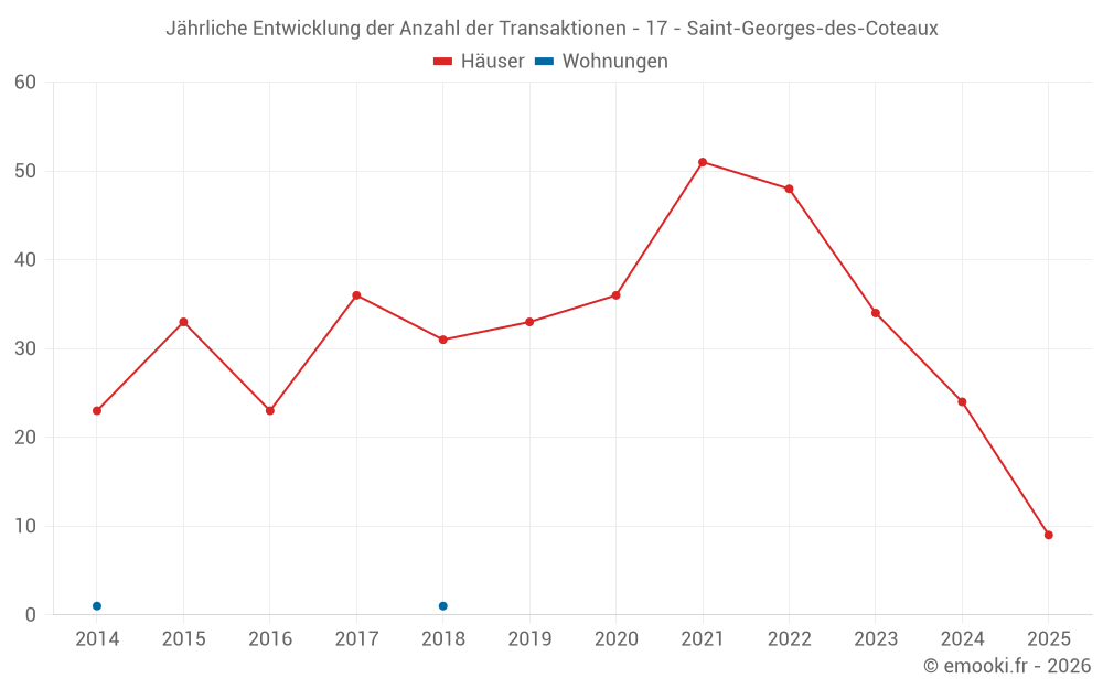 Der Durchschnittspreis auf den 21 Hausgeschäften der letzten 12 Monate in der Gemeinde Saint-Georges-des-Coteaux betrug 2 521 € pro Quadratmeter für einen mittleren Immobilienwert von 264 300 €. Über diesen Zeitraum hinweg lagen 60% der Transaktionen zwischen 2 113 und 2 926 € pro Quadratmeter (vom 2. bis zum 8. Dezil).