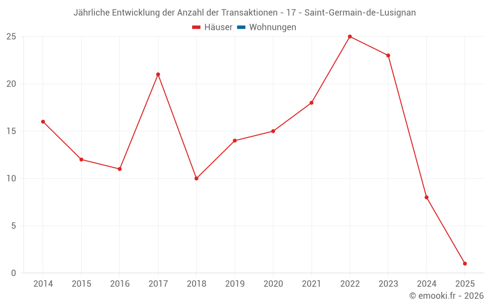 Der Durchschnittspreis auf den 19 Hausgeschäften der letzten 24 Monate in der Gemeinde Saint-Germain-de-Lusignan betrug 1 406 € pro Quadratmeter für einen mittleren Immobilienwert von 162 000 €. Über diesen Zeitraum hinweg lagen 60% der Transaktionen zwischen 933 und 2 128 € pro Quadratmeter (vom 2. bis zum 8. Dezil).