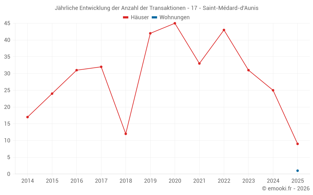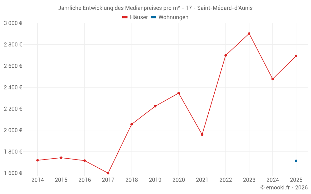Der Durchschnittspreis auf den 23 Hausgeschäften der letzten 12 Monate in der Gemeinde Saint-Médard-d'Aunis betrug 2 477 € pro Quadratmeter für einen mittleren Immobilienwert von 256 500 €. Über diesen Zeitraum hinweg lagen 60% der Transaktionen zwischen 1 347 und 3 424 € pro Quadratmeter (vom 2. bis zum 8. Dezil).