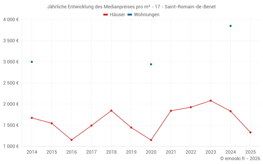 Der Durchschnittspreis auf den 21 Hausgeschäften der letzten 12 Monate in der Gemeinde Saint-Romain-de-Benet betrug 1 876 € pro Quadratmeter für einen mittleren Immobilienwert von 205 000 €. Über diesen Zeitraum hinweg lagen 60% der Transaktionen zwischen 1 240 und 2 504 € pro Quadratmeter (vom 2. bis zum 8. Dezil).