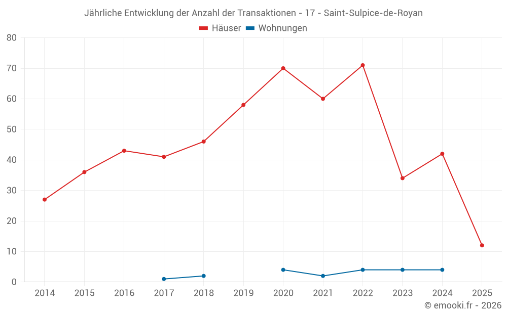 Der Durchschnittspreis auf den 36 Hausgeschäften der letzten 12 Monate in der Gemeinde Saint-Sulpice-de-Royan betrug 3 020 € pro Quadratmeter für einen mittleren Immobilienwert von 297 975 €. Über diesen Zeitraum hinweg lagen 60% der Transaktionen zwischen 2 454 und 3 499 € pro Quadratmeter (vom 2. bis zum 8. Dezil).