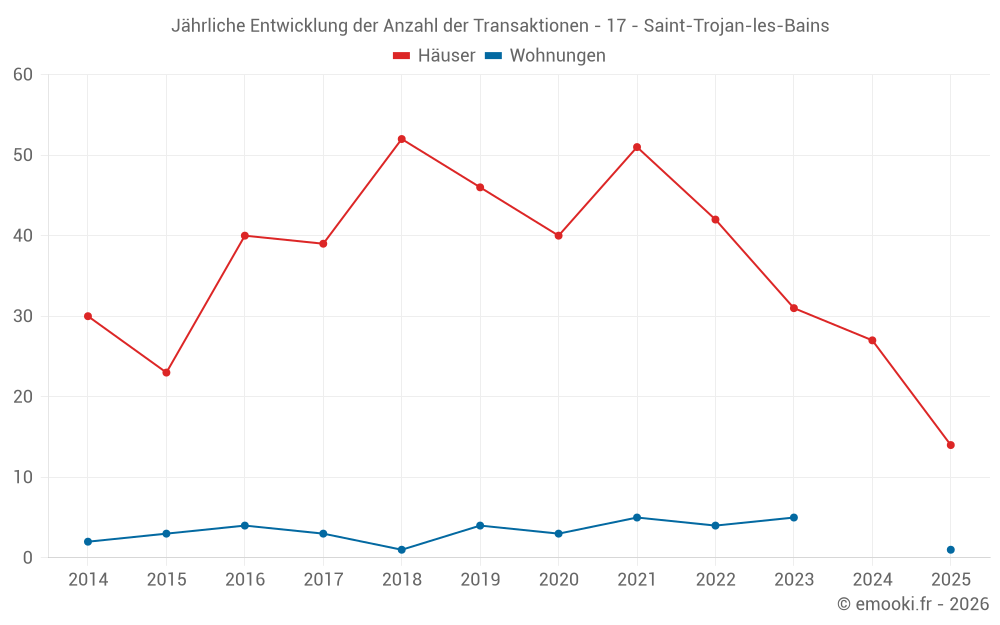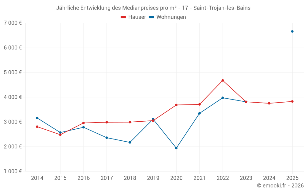 Der Durchschnittspreis auf den 33 Hausgeschäften der letzten 12 Monate in der Gemeinde Saint-Trojan-les-Bains betrug 3 820 € pro Quadratmeter für einen mittleren Immobilienwert von 258 500 €. Über diesen Zeitraum hinweg lagen 60% der Transaktionen zwischen 2 748 und 4 558 € pro Quadratmeter (vom 2. bis zum 8. Dezil).