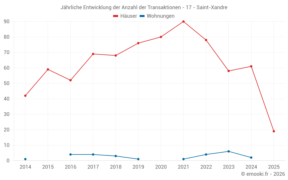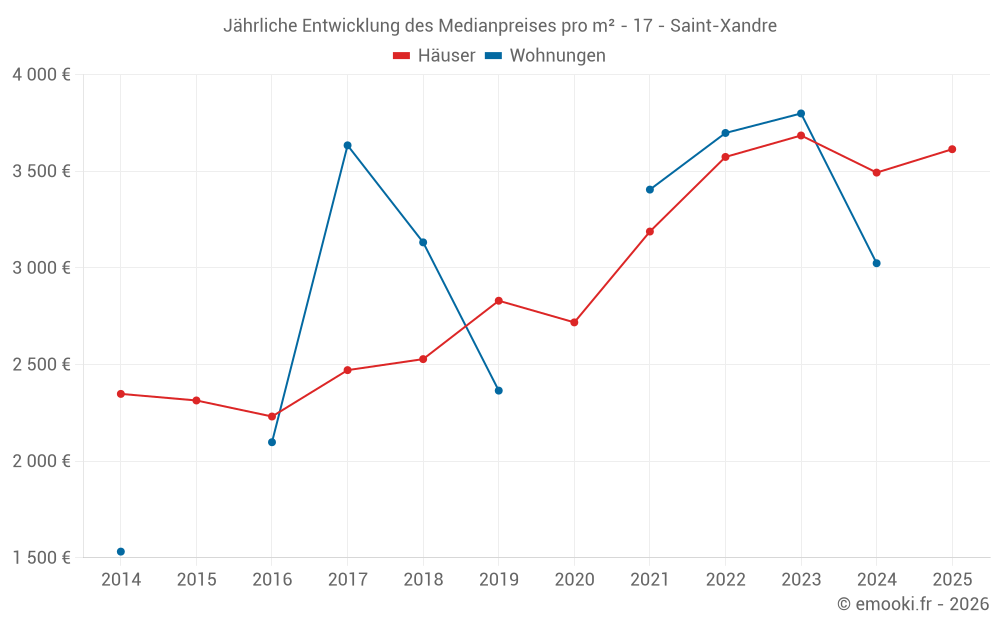 Der Durchschnittspreis auf den 19 Hausgeschäften der letzten 6 Monate in der Gemeinde Saint-Xandre betrug 3 614 € pro Quadratmeter für einen mittleren Immobilienwert von 305 000 €. Über diesen Zeitraum hinweg lagen 60% der Transaktionen zwischen 3 149 und 3 872 € pro Quadratmeter (vom 2. bis zum 8. Dezil).
