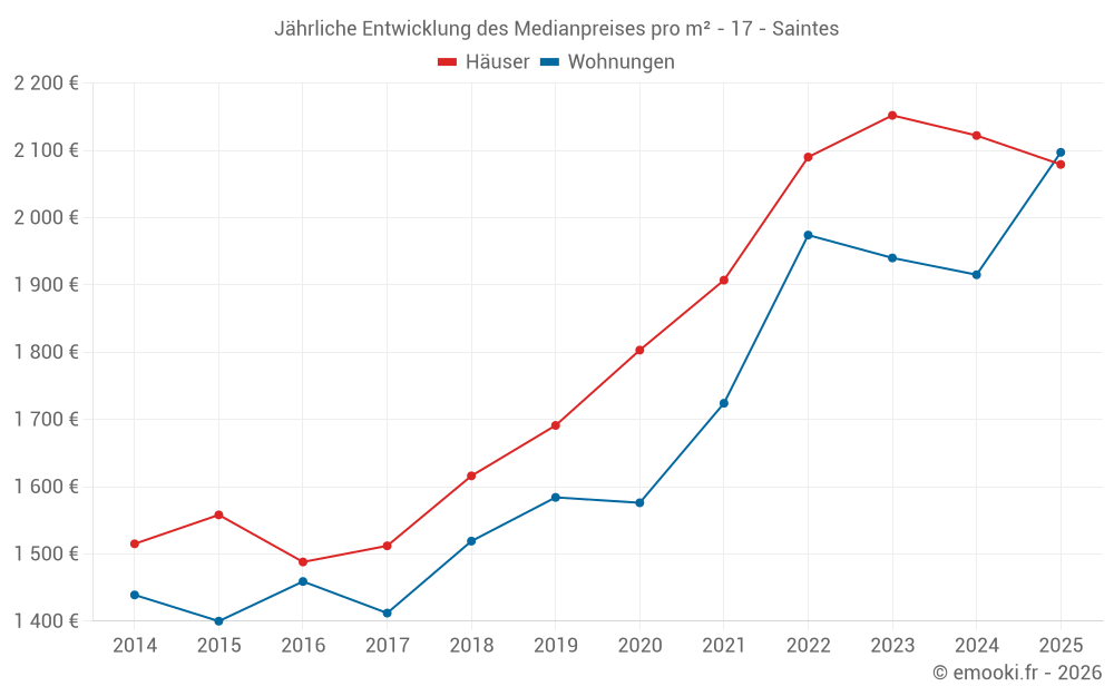 Der Durchschnittspreis auf den 39 Wohnungstransaktionen der letzten 6 Monate in der Gemeinde Saintes betrug 2 097 € pro Quadratmeter für einen mittleren Immobilienwert von 114 000 €. Über diesen Zeitraum hinweg lagen 60% der Transaktionen zwischen 1 861 und 2 380 € pro Quadratmeter (vom 2. bis zum 8. Dezil).