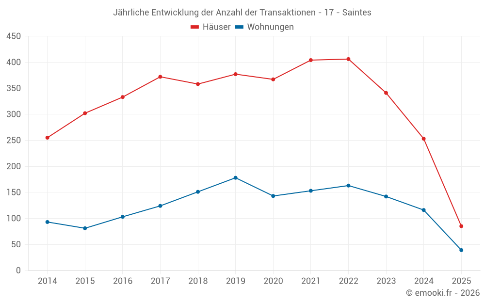 Der Durchschnittspreis auf den 85 Hausgeschäften der letzten 6 Monate in der Gemeinde Saintes betrug 2 079 € pro Quadratmeter für einen mittleren Immobilienwert von 180 564 €. Über diesen Zeitraum hinweg lagen 60% der Transaktionen zwischen 1 385 und 2 602 € pro Quadratmeter (vom 2. bis zum 8. Dezil).