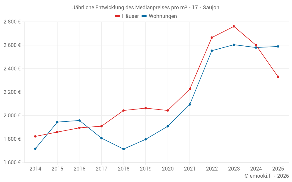 Der Durchschnittspreis auf den 39 Wohnungstransaktionen der letzten 24 Monate in der Gemeinde Saujon betrug 2 593 € pro Quadratmeter für einen mittleren Immobilienwert von 141 000 €. Über diesen Zeitraum hinweg lagen 60% der Transaktionen zwischen 2 372 und 2 944 € pro Quadratmeter (vom 2. bis zum 8. Dezil).