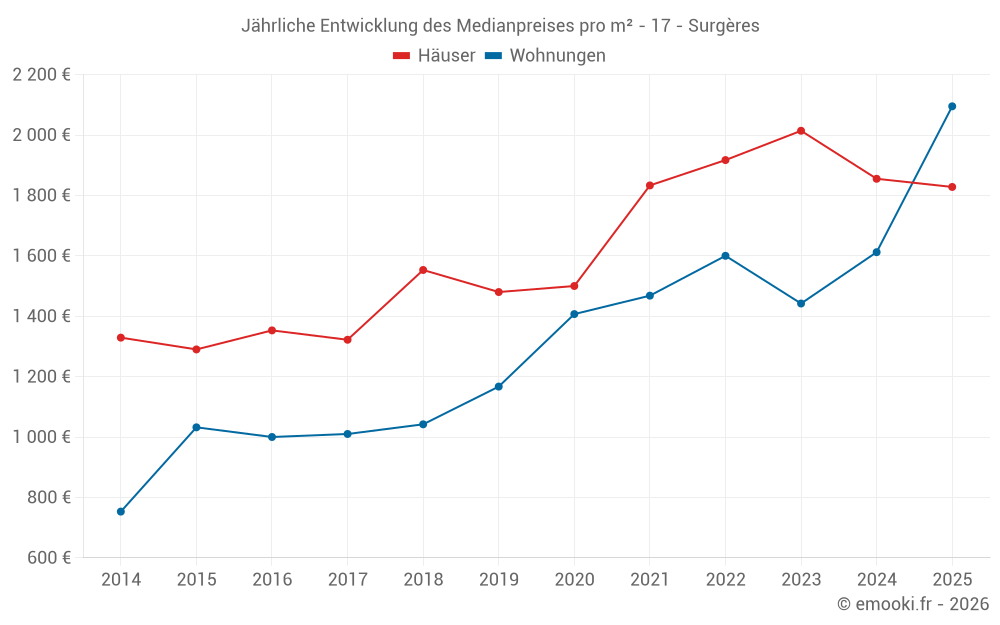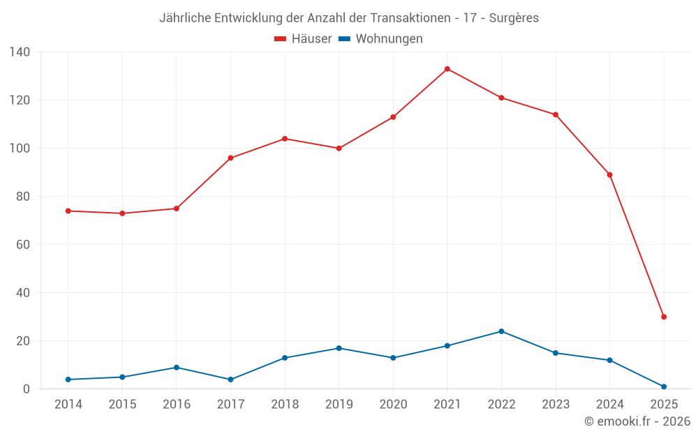Der Durchschnittspreis auf den 30 Hausgeschäften der letzten 6 Monate in der Gemeinde Surgères betrug 1 828 € pro Quadratmeter für einen mittleren Immobilienwert von 173 000 €. Über diesen Zeitraum hinweg lagen 60% der Transaktionen zwischen 1 360 und 2 626 € pro Quadratmeter (vom 2. bis zum 8. Dezil).