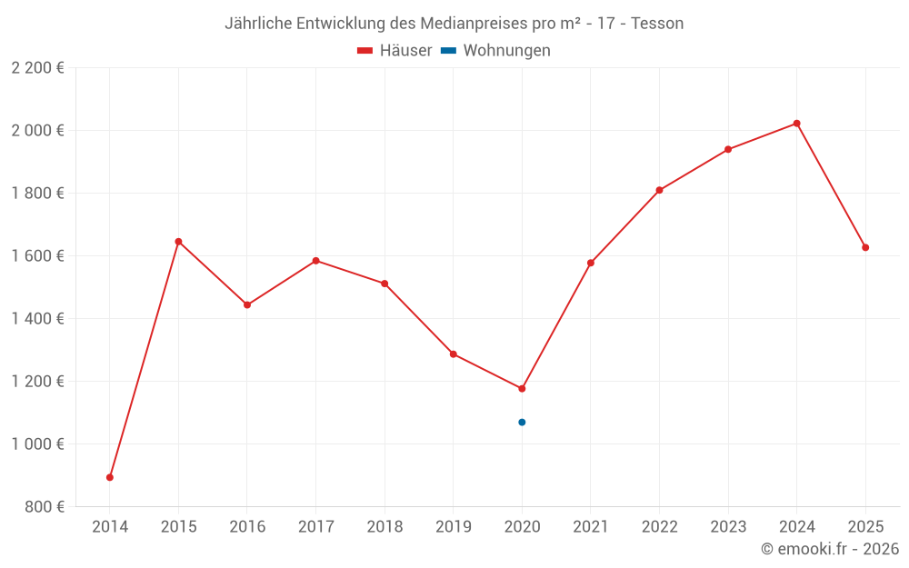 Der Durchschnittspreis auf den 17 Hausgeschäften der letzten 12 Monate in der Gemeinde Tesson betrug 1 651 € pro Quadratmeter für einen mittleren Immobilienwert von 166 150 €. Über diesen Zeitraum hinweg lagen 60% der Transaktionen zwischen 1 036 und 2 339 € pro Quadratmeter (vom 2. bis zum 8. Dezil).