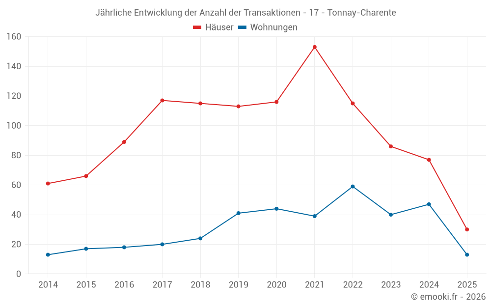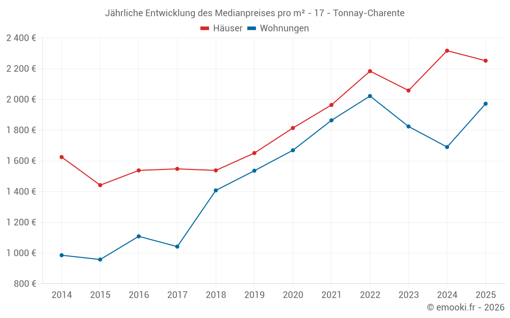 Der Durchschnittspreis auf den 30 Hausgeschäften der letzten 6 Monate in der Gemeinde Tonnay-Charente betrug 2 252 € pro Quadratmeter für einen mittleren Immobilienwert von 197 500 €. Über diesen Zeitraum hinweg lagen 60% der Transaktionen zwischen 1 609 und 2 750 € pro Quadratmeter (vom 2. bis zum 8. Dezil).