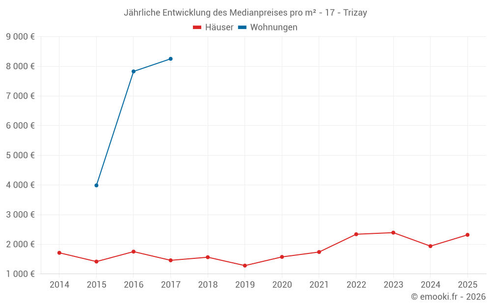 Der Durchschnittspreis auf den 29 Hausgeschäften der letzten 24 Monate in der Gemeinde Trizay betrug 2 096 € pro Quadratmeter für einen mittleren Immobilienwert von 218 000 €. Über diesen Zeitraum hinweg lagen 60% der Transaktionen zwischen 1 464 und 2 697 € pro Quadratmeter (vom 2. bis zum 8. Dezil).
