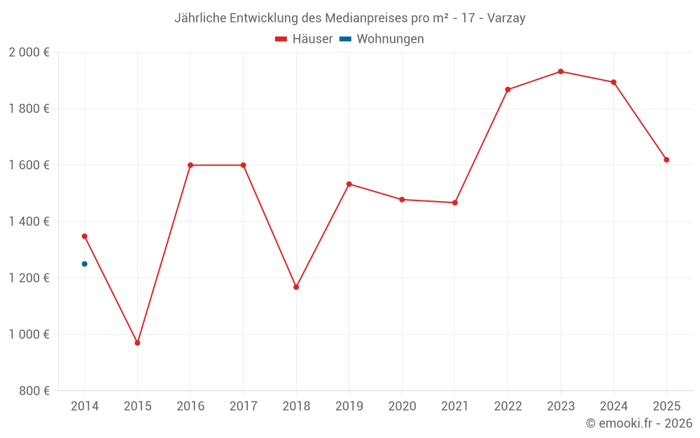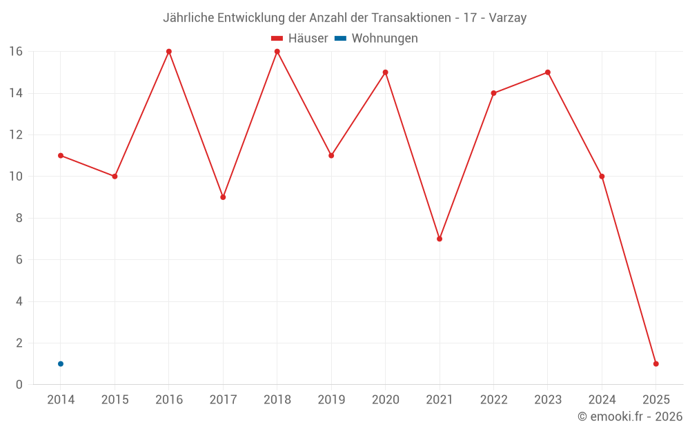 Der Durchschnittspreis auf den 16 Hausgeschäften der letzten 24 Monate in der Gemeinde Varzay betrug 1 860 € pro Quadratmeter für einen mittleren Immobilienwert von 172 050 €. Über diesen Zeitraum hinweg lagen 60% der Transaktionen zwischen 1 079 und 2 111 € pro Quadratmeter (vom 2. bis zum 8. Dezil).