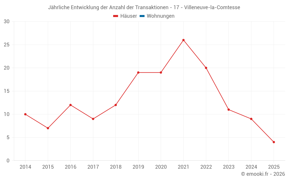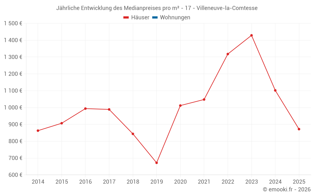 Der Durchschnittspreis auf den 17 Hausgeschäften der letzten 24 Monate in der Gemeinde Villeneuve-la-Comtesse betrug 1 231 € pro Quadratmeter für einen mittleren Immobilienwert von 90 000 €. Über diesen Zeitraum hinweg lagen 60% der Transaktionen zwischen 711 und 1 495 € pro Quadratmeter (vom 2. bis zum 8. Dezil).