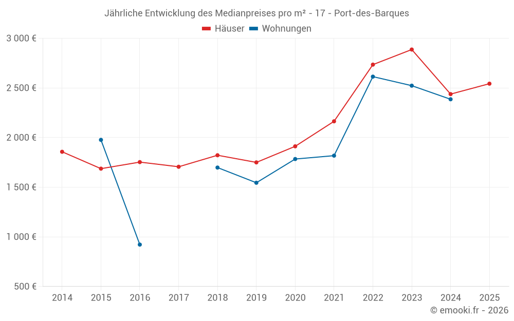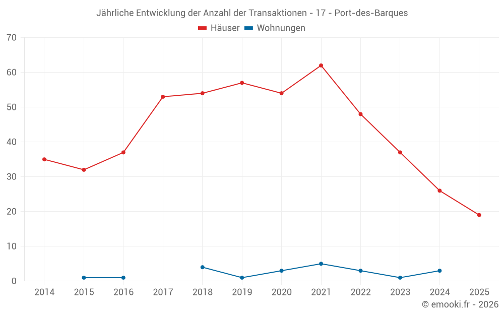 Der Durchschnittspreis auf den 19 Hausgeschäften der letzten 6 Monate in der Gemeinde Port-des-Barques betrug 2 543 € pro Quadratmeter für einen mittleren Immobilienwert von 255 000 €. Über diesen Zeitraum hinweg lagen 60% der Transaktionen zwischen 2 173 und 3 090 € pro Quadratmeter (vom 2. bis zum 8. Dezil).
