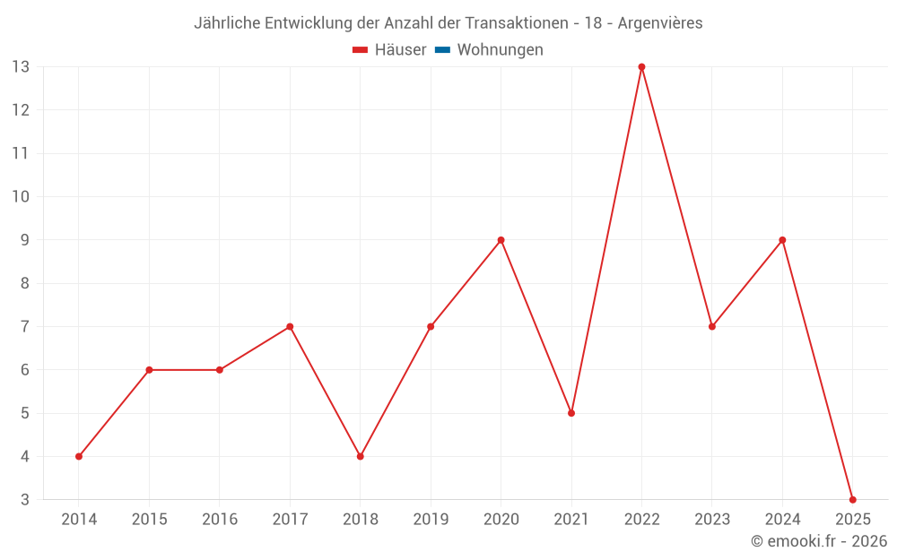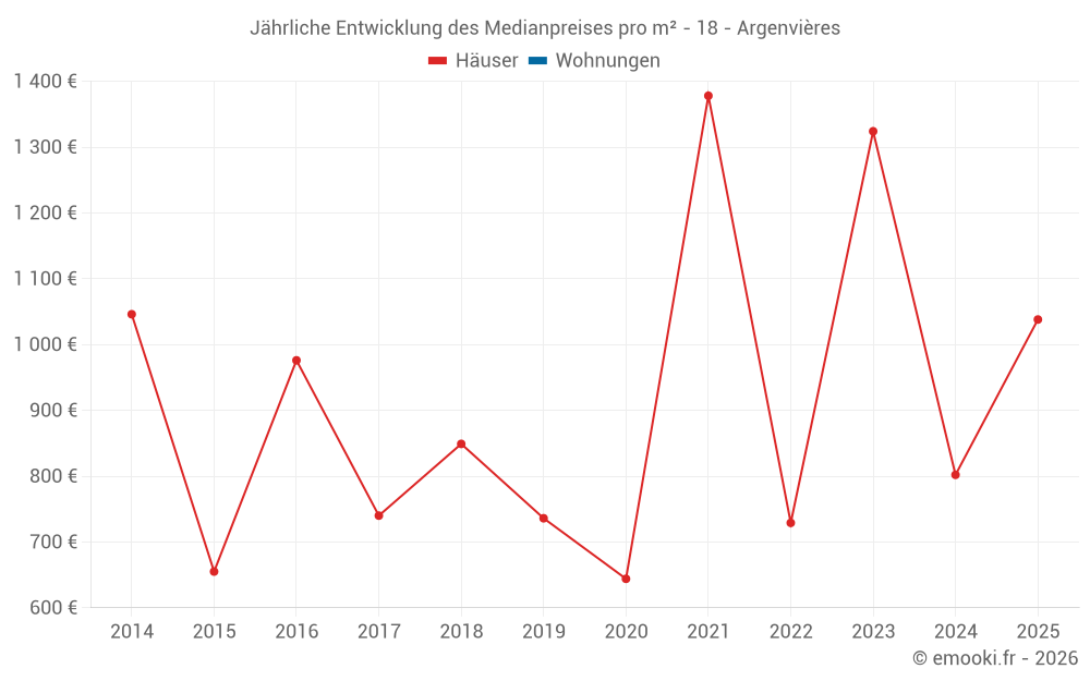 Der Durchschnittspreis auf den 15 Hausgeschäften der letzten 24 Monate in der Gemeinde Argenvières betrug 802 € pro Quadratmeter für einen mittleren Immobilienwert von 63 000 €. Über diesen Zeitraum hinweg lagen 60% der Transaktionen zwischen 579 und 1 120 € pro Quadratmeter (vom 2. bis zum 8. Dezil).