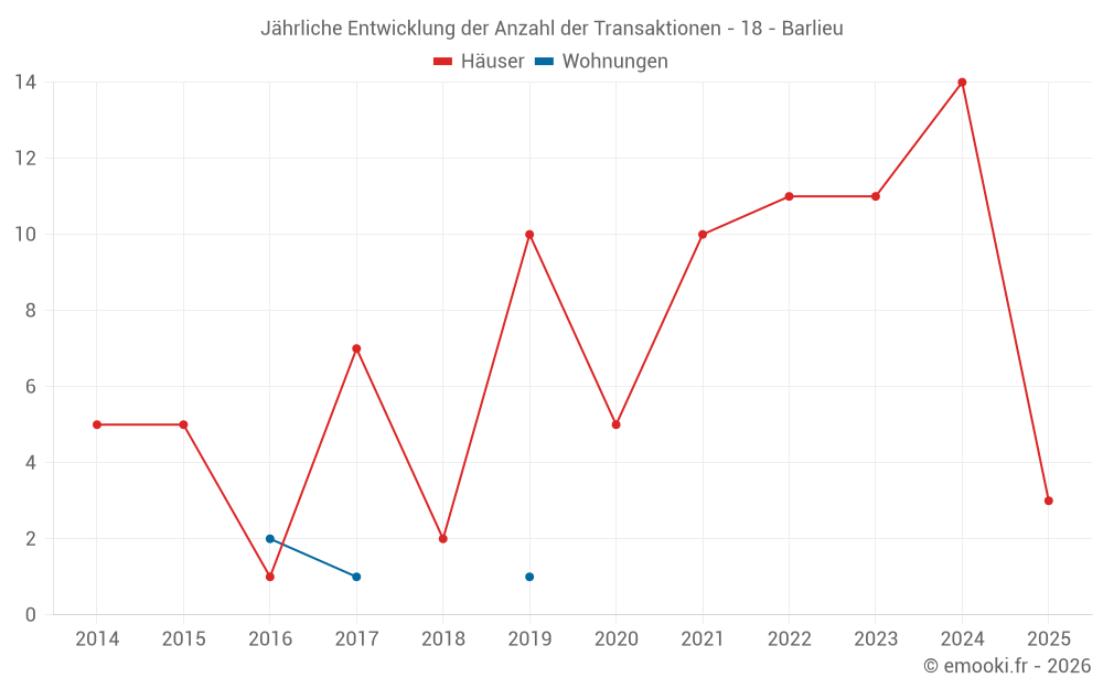 Der Durchschnittspreis auf den 23 Hausgeschäften der letzten 24 Monate in der Gemeinde Barlieu betrug 867 € pro Quadratmeter für einen mittleren Immobilienwert von 68 000 €. Über diesen Zeitraum hinweg lagen 60% der Transaktionen zwischen 590 und 1 261 € pro Quadratmeter (vom 2. bis zum 8. Dezil).