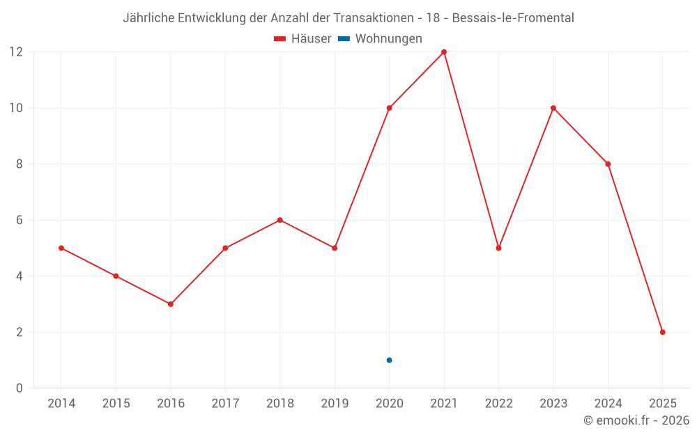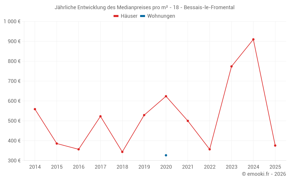 Der Durchschnittspreis auf den 14 Hausgeschäften der letzten 24 Monate in der Gemeinde Bessais-le-Fromental betrug 838 € pro Quadratmeter für einen mittleren Immobilienwert von 101 200 €. Über diesen Zeitraum hinweg lagen 60% der Transaktionen zwischen 637 und 1 241 € pro Quadratmeter (vom 2. bis zum 8. Dezil).