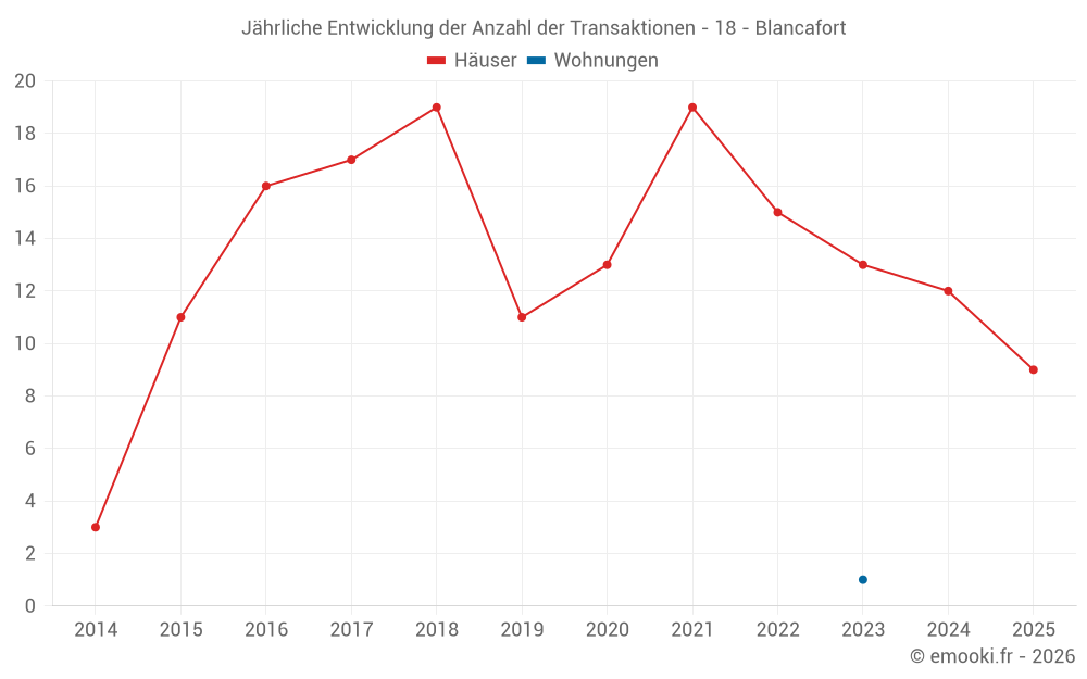 Der Durchschnittspreis auf den 28 Hausgeschäften der letzten 24 Monate in der Gemeinde Blancafort betrug 1 116 € pro Quadratmeter für einen mittleren Immobilienwert von 90 500 €. Über diesen Zeitraum hinweg lagen 60% der Transaktionen zwischen 517 und 1 422 € pro Quadratmeter (vom 2. bis zum 8. Dezil).