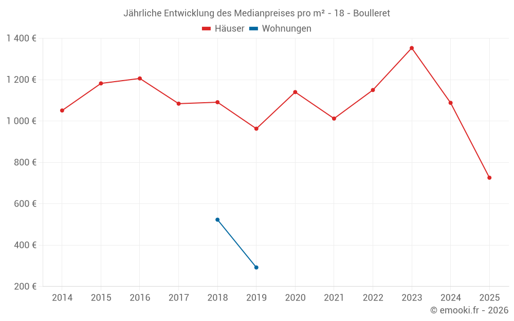 Der Durchschnittspreis auf den 16 Hausgeschäften der letzten 12 Monate in der Gemeinde Boulleret betrug 1 114 € pro Quadratmeter für einen mittleren Immobilienwert von 91 500 €. Über diesen Zeitraum hinweg lagen 60% der Transaktionen zwischen 658 und 1 464 € pro Quadratmeter (vom 2. bis zum 8. Dezil).