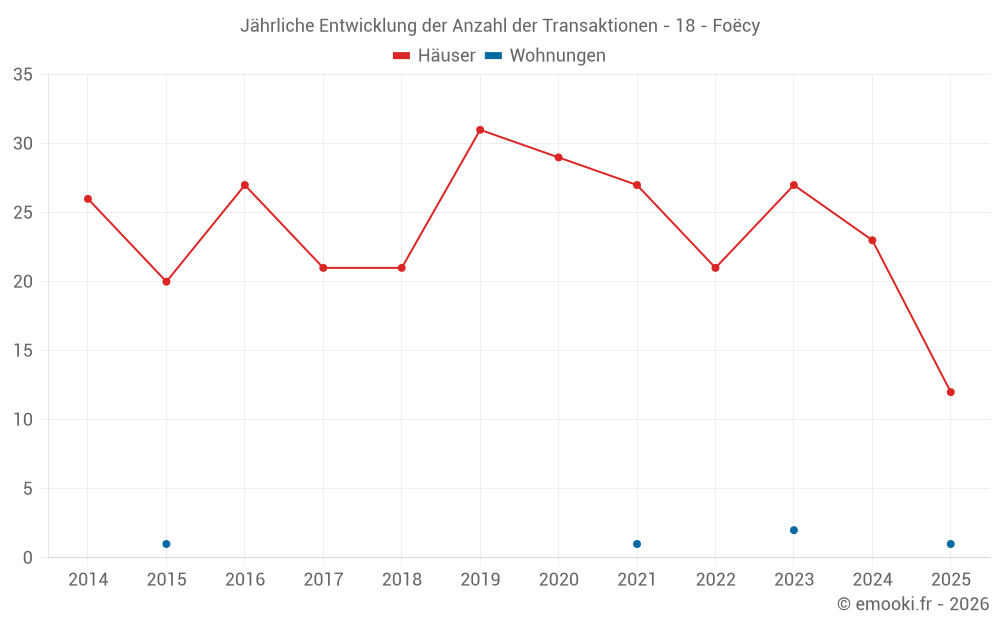 Der Durchschnittspreis auf den 28 Hausgeschäften der letzten 12 Monate in der Gemeinde Foëcy betrug 1 080 € pro Quadratmeter für einen mittleren Immobilienwert von 80 800 €. Über diesen Zeitraum hinweg lagen 60% der Transaktionen zwischen 713 und 1 617 € pro Quadratmeter (vom 2. bis zum 8. Dezil).