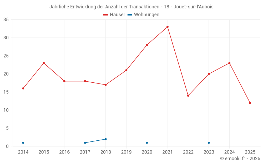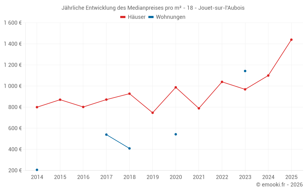 Der Durchschnittspreis auf den 24 Hausgeschäften der letzten 12 Monate in der Gemeinde Jouet-sur-l'Aubois betrug 1 072 € pro Quadratmeter für einen mittleren Immobilienwert von 91 750 €. Über diesen Zeitraum hinweg lagen 60% der Transaktionen zwischen 723 und 1 595 € pro Quadratmeter (vom 2. bis zum 8. Dezil).