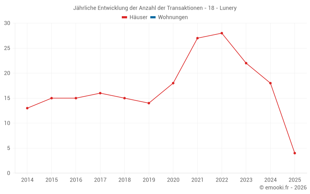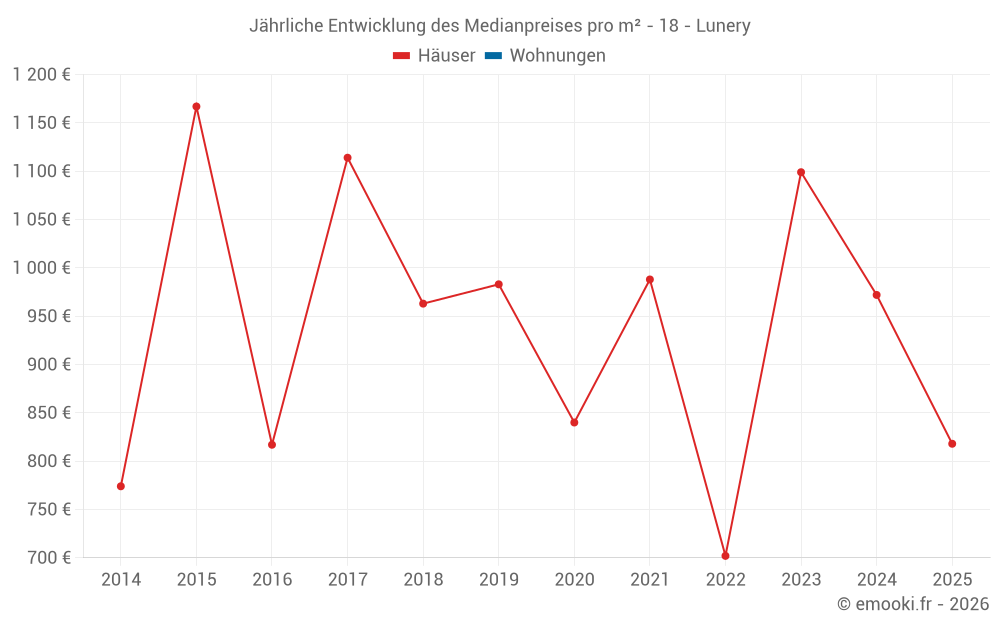 Der Durchschnittspreis auf den 16 Hausgeschäften der letzten 12 Monate in der Gemeinde Lunery betrug 988 € pro Quadratmeter für einen mittleren Immobilienwert von 73 000 €. Über diesen Zeitraum hinweg lagen 60% der Transaktionen zwischen 857 und 1 161 € pro Quadratmeter (vom 2. bis zum 8. Dezil).