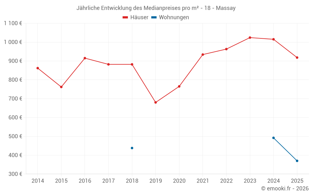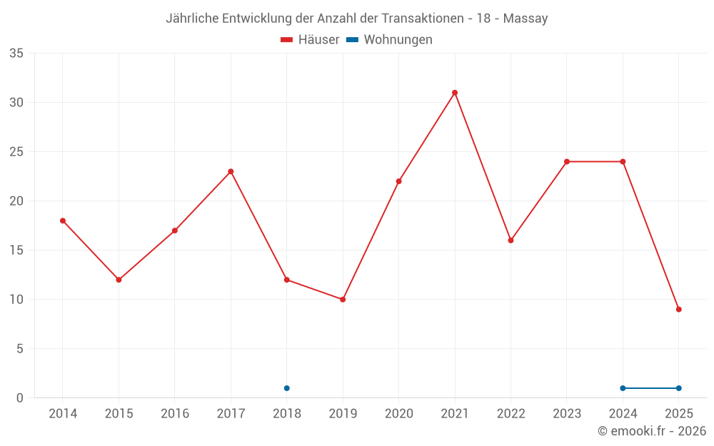 Der Durchschnittspreis auf den 23 Hausgeschäften der letzten 12 Monate in der Gemeinde Massay betrug 960 € pro Quadratmeter für einen mittleren Immobilienwert von 70 200 €. Über diesen Zeitraum hinweg lagen 60% der Transaktionen zwischen 500 und 1 328 € pro Quadratmeter (vom 2. bis zum 8. Dezil).