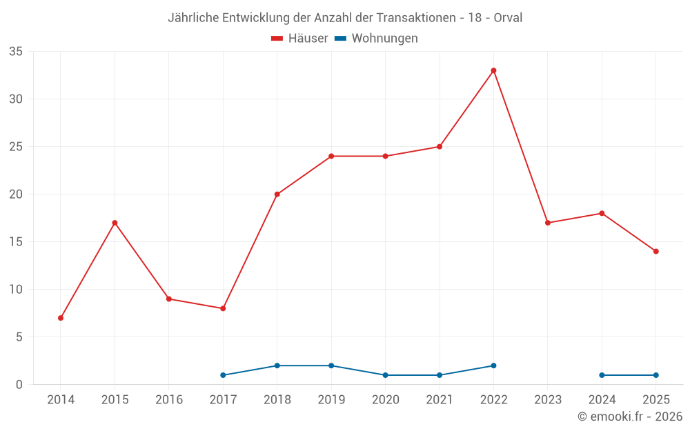 Der Durchschnittspreis auf den 22 Hausgeschäften der letzten 12 Monate in der Gemeinde Orval betrug 1 039 € pro Quadratmeter für einen mittleren Immobilienwert von 80 000 €. Über diesen Zeitraum hinweg lagen 60% der Transaktionen zwischen 908 und 1 228 € pro Quadratmeter (vom 2. bis zum 8. Dezil).