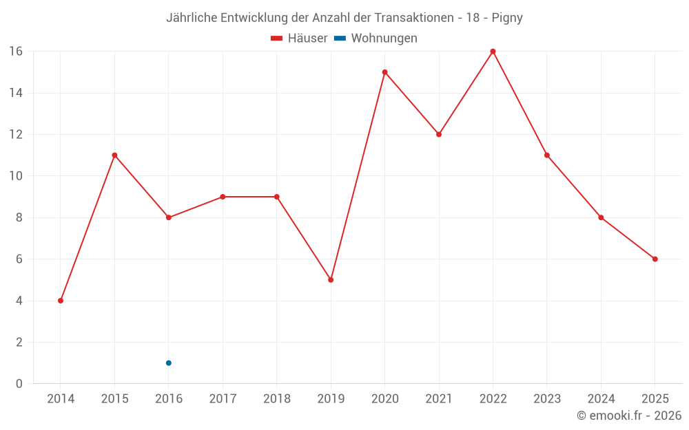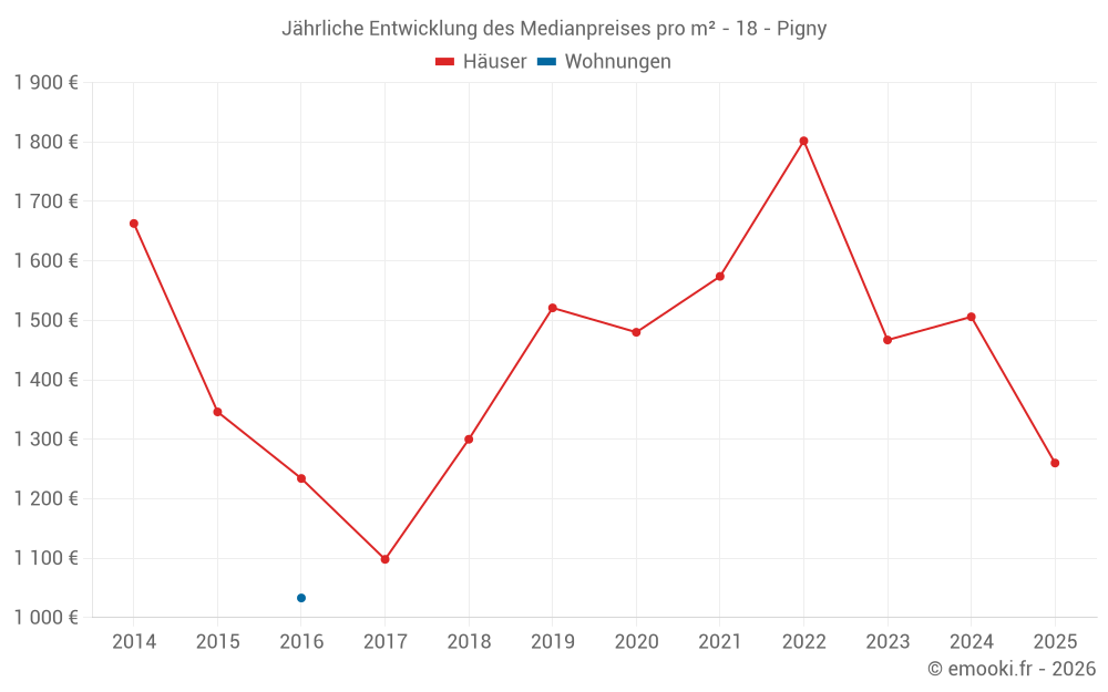 Der Durchschnittspreis auf den 22 Hausgeschäften der letzten 24 Monate in der Gemeinde Pigny betrug 1 452 € pro Quadratmeter für einen mittleren Immobilienwert von 168 500 €. Über diesen Zeitraum hinweg lagen 60% der Transaktionen zwischen 1 077 und 1 868 € pro Quadratmeter (vom 2. bis zum 8. Dezil).