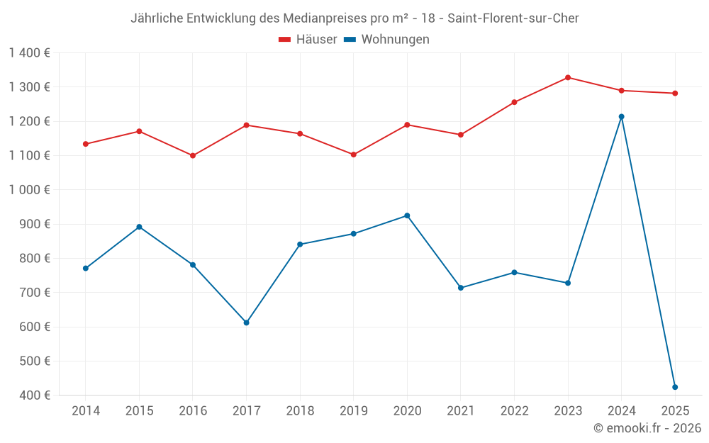 Der Durchschnittspreis auf den 22 Wohnungstransaktionen der letzten 24 Monate in der Gemeinde Saint-Florent-sur-Cher betrug 1 010 € pro Quadratmeter für einen mittleren Immobilienwert von 51 160 €. Über diesen Zeitraum hinweg lagen 60% der Transaktionen zwischen 605 und 1 243 € pro Quadratmeter (vom 2. bis zum 8. Dezil).