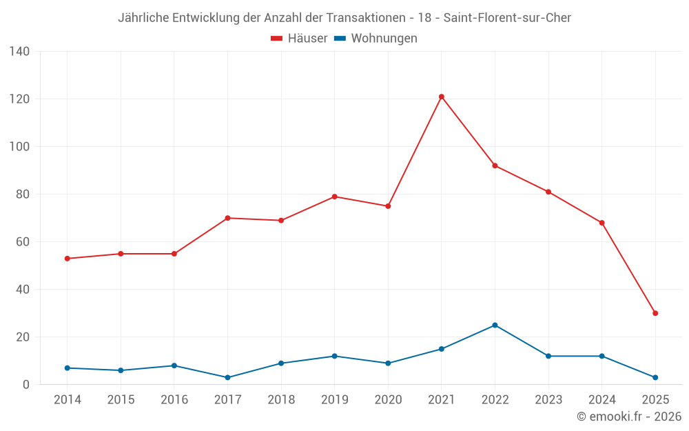Der Durchschnittspreis auf den 30 Hausgeschäften der letzten 6 Monate in der Gemeinde Saint-Florent-sur-Cher betrug 1 282 € pro Quadratmeter für einen mittleren Immobilienwert von 118 000 €. Über diesen Zeitraum hinweg lagen 60% der Transaktionen zwischen 886 und 1 717 € pro Quadratmeter (vom 2. bis zum 8. Dezil).
