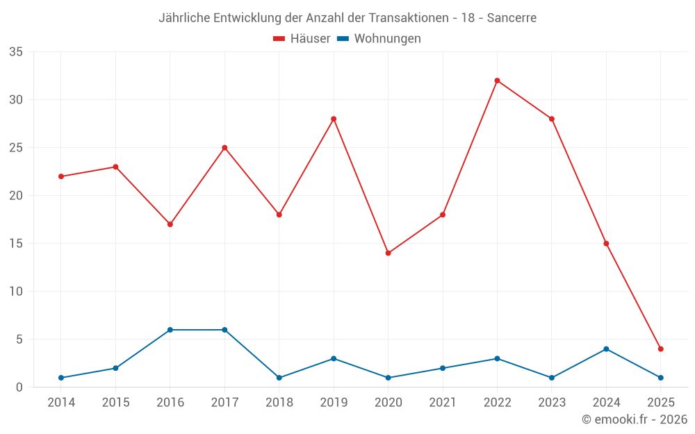 Der Durchschnittspreis auf den 35 Hausgeschäften der letzten 24 Monate in der Gemeinde Sancerre betrug 1 446 € pro Quadratmeter für einen mittleren Immobilienwert von 145 000 €. Über diesen Zeitraum hinweg lagen 60% der Transaktionen zwischen 1 078 und 1 882 € pro Quadratmeter (vom 2. bis zum 8. Dezil).