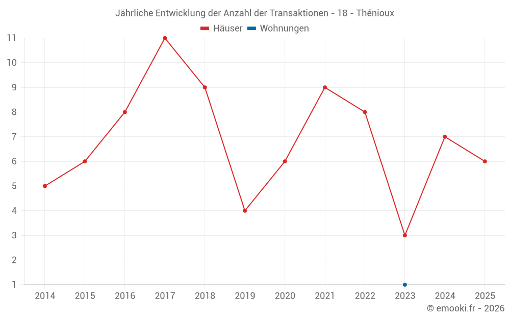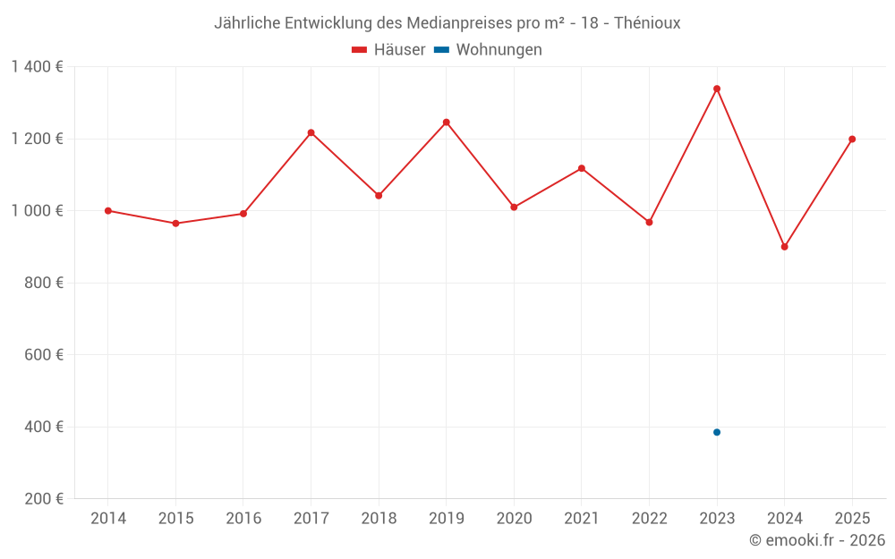 Der Durchschnittspreis auf den 14 Hausgeschäften der letzten 24 Monate in der Gemeinde Thénioux betrug 1 112 € pro Quadratmeter für einen mittleren Immobilienwert von 90 995 €. Über diesen Zeitraum hinweg lagen 60% der Transaktionen zwischen 697 und 1 287 € pro Quadratmeter (vom 2. bis zum 8. Dezil).