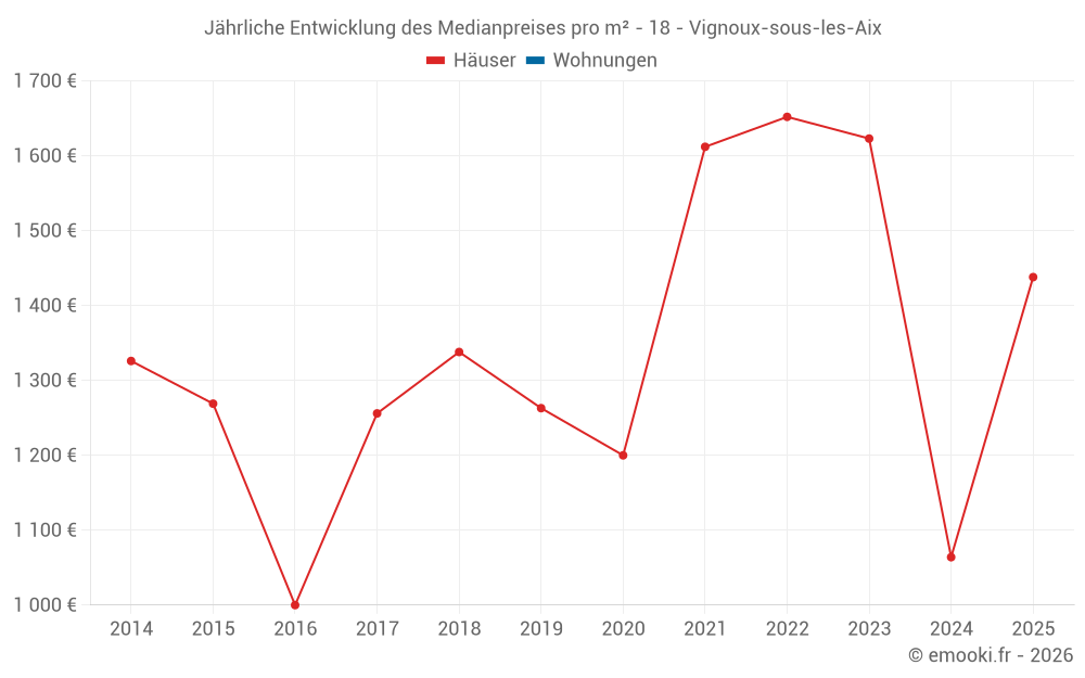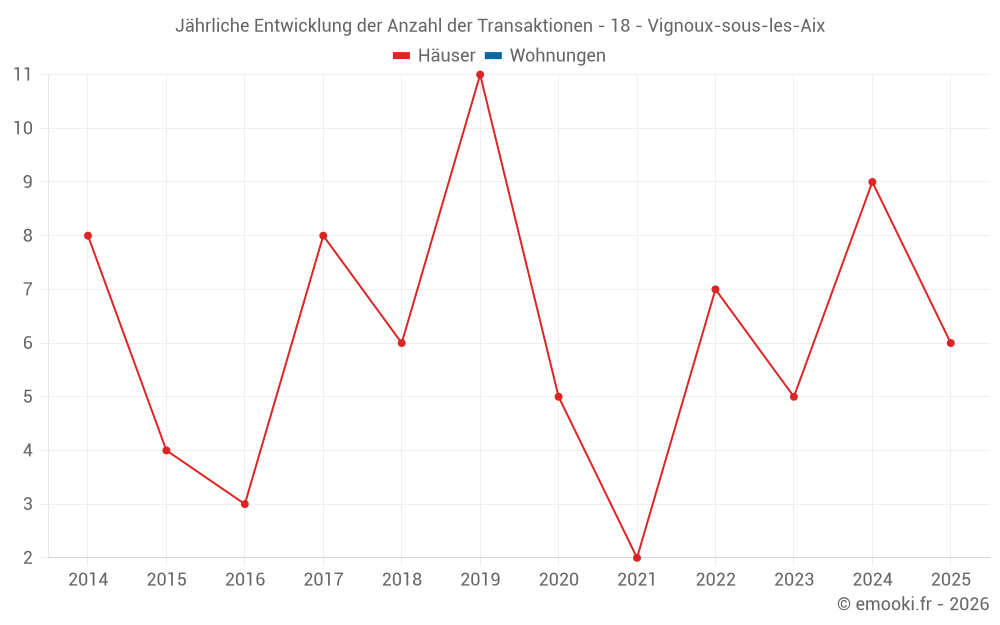Der Durchschnittspreis auf den 18 Hausgeschäften der letzten 24 Monate in der Gemeinde Vignoux-sous-les-Aix betrug 1 220 € pro Quadratmeter für einen mittleren Immobilienwert von 130 000 €. Über diesen Zeitraum hinweg lagen 60% der Transaktionen zwischen 1 002 und 1 729 € pro Quadratmeter (vom 2. bis zum 8. Dezil).