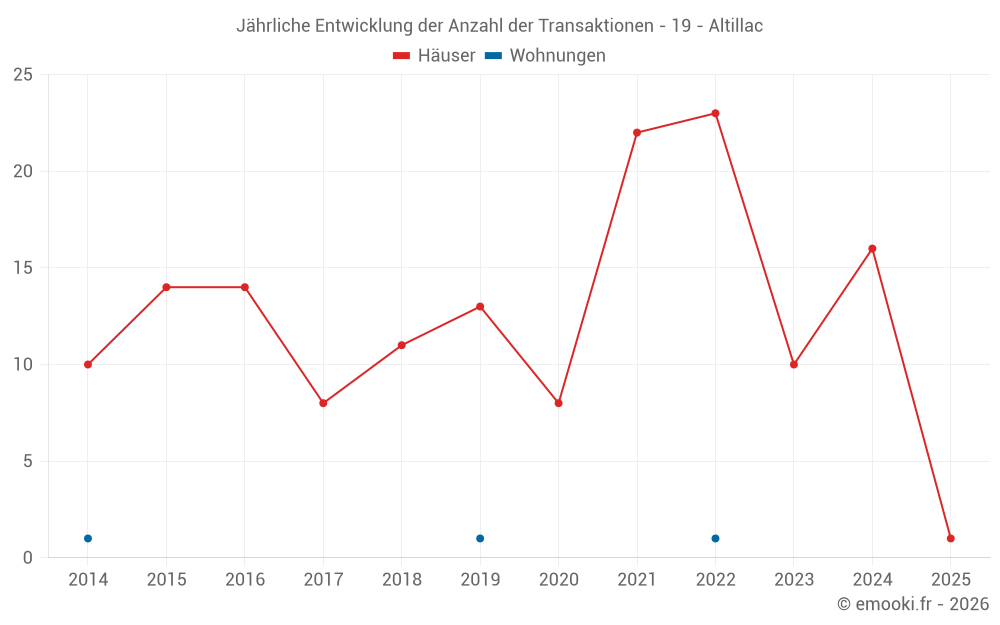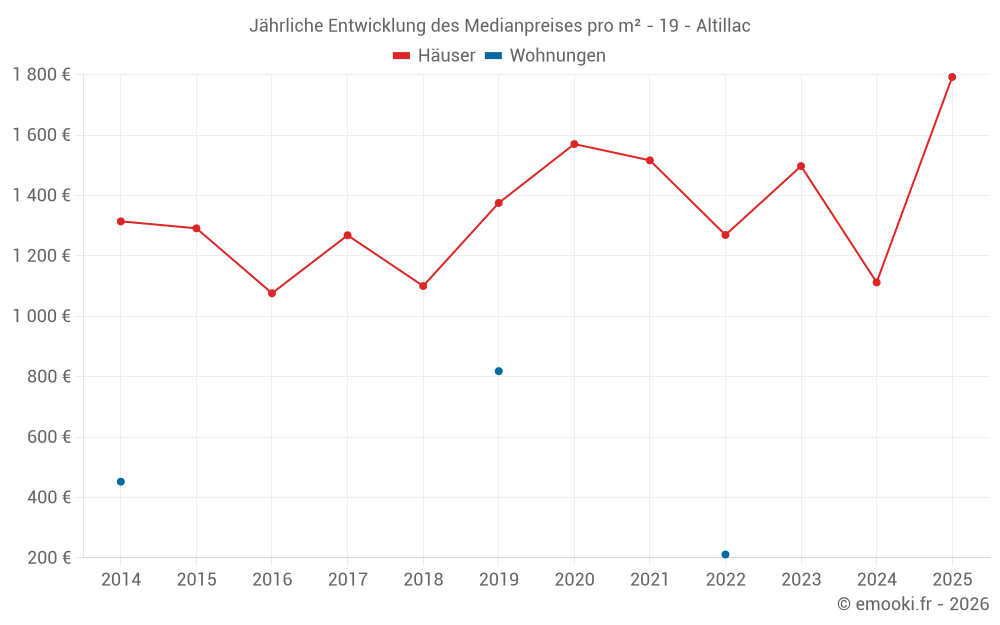 Der Durchschnittspreis auf den 21 Hausgeschäften der letzten 24 Monate in der Gemeinde Altillac betrug 1 481 € pro Quadratmeter für einen mittleren Immobilienwert von 110 000 €. Über diesen Zeitraum hinweg lagen 60% der Transaktionen zwischen 789 und 1 792 € pro Quadratmeter (vom 2. bis zum 8. Dezil).