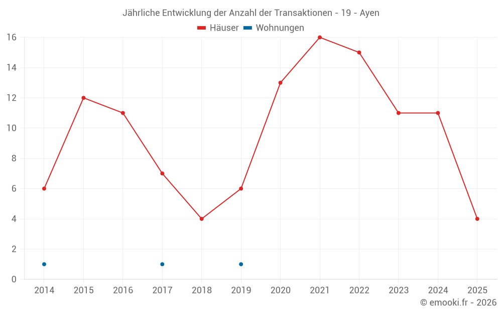 Der Durchschnittspreis auf den 22 Hausgeschäften der letzten 24 Monate in der Gemeinde Ayen betrug 1 072 € pro Quadratmeter für einen mittleren Immobilienwert von 91 500 €. Über diesen Zeitraum hinweg lagen 60% der Transaktionen zwischen 758 und 1 506 € pro Quadratmeter (vom 2. bis zum 8. Dezil).