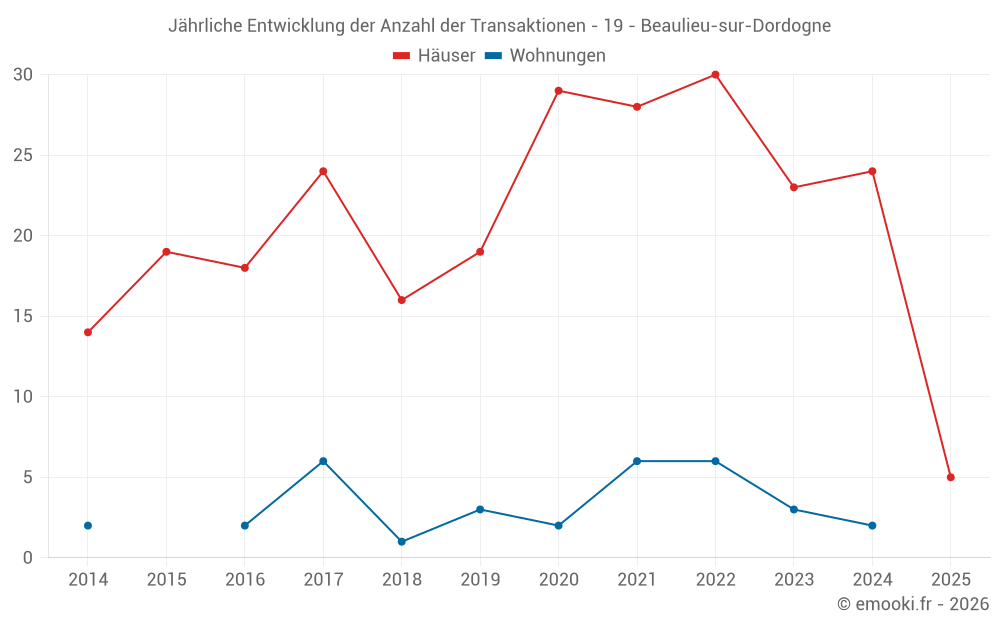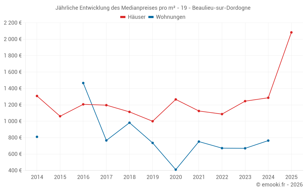 Der Durchschnittspreis auf den 39 Hausgeschäften der letzten 24 Monate in der Gemeinde Beaulieu-sur-Dordogne betrug 1 245 € pro Quadratmeter für einen mittleren Immobilienwert von 90 250 €. Über diesen Zeitraum hinweg lagen 60% der Transaktionen zwischen 461 und 2 195 € pro Quadratmeter (vom 2. bis zum 8. Dezil).