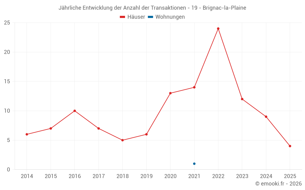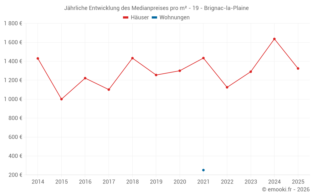 Der Durchschnittspreis auf den 20 Hausgeschäften der letzten 24 Monate in der Gemeinde Brignac-la-Plaine betrug 1 596 € pro Quadratmeter für einen mittleren Immobilienwert von 146 000 €. Über diesen Zeitraum hinweg lagen 60% der Transaktionen zwischen 895 und 1 968 € pro Quadratmeter (vom 2. bis zum 8. Dezil).