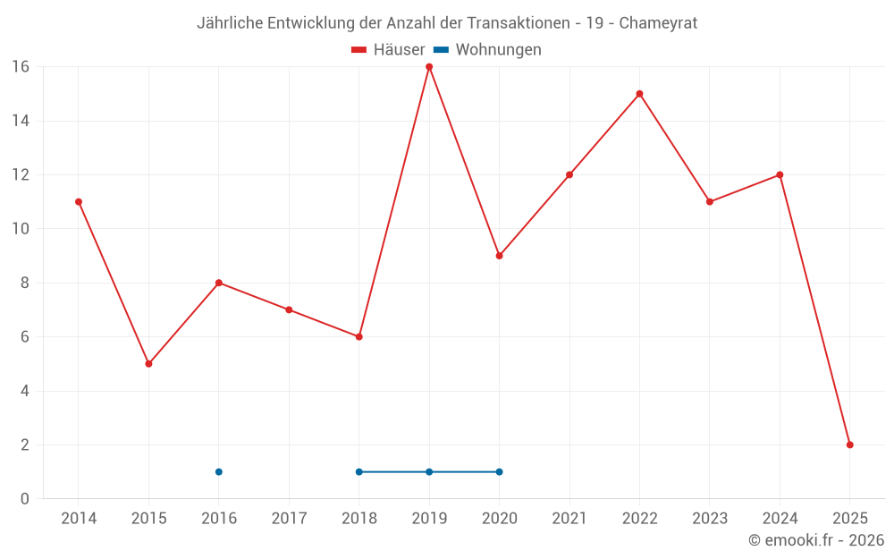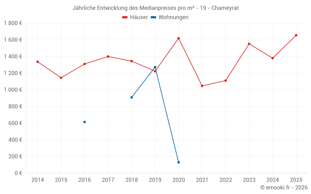 Der Durchschnittspreis auf den 18 Hausgeschäften der letzten 24 Monate in der Gemeinde Chameyrat betrug 1 428 € pro Quadratmeter für einen mittleren Immobilienwert von 113 500 €. Über diesen Zeitraum hinweg lagen 60% der Transaktionen zwischen 737 und 1 741 € pro Quadratmeter (vom 2. bis zum 8. Dezil).