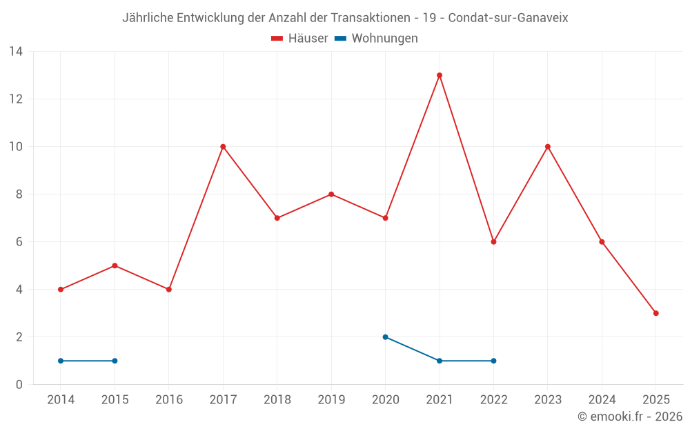 Der Durchschnittspreis auf den 14 Hausgeschäften der letzten 24 Monate in der Gemeinde Condat-sur-Ganaveix betrug 1 214 € pro Quadratmeter für einen mittleren Immobilienwert von 99 900 €. Über diesen Zeitraum hinweg lagen 60% der Transaktionen zwischen 698 und 1 706 € pro Quadratmeter (vom 2. bis zum 8. Dezil).