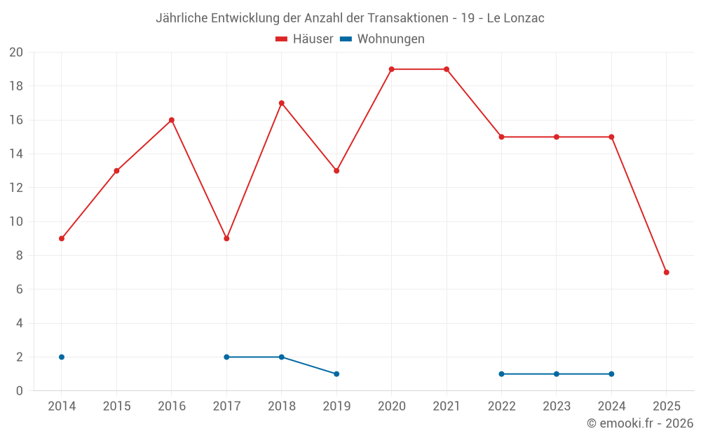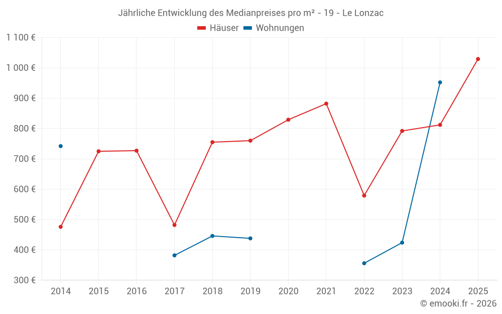 Der Durchschnittspreis auf den 27 Hausgeschäften der letzten 24 Monate in der Gemeinde Le Lonzac betrug 812 € pro Quadratmeter für einen mittleren Immobilienwert von 80 400 €. Über diesen Zeitraum hinweg lagen 60% der Transaktionen zwischen 460 und 1 423 € pro Quadratmeter (vom 2. bis zum 8. Dezil).
