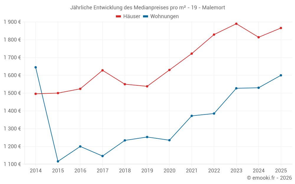Der Durchschnittspreis auf den 30 Hausgeschäften der letzten 6 Monate in der Gemeinde Malemort betrug 1 866 € pro Quadratmeter für einen mittleren Immobilienwert von 185 835 €. Über diesen Zeitraum hinweg lagen 60% der Transaktionen zwischen 1 569 und 2 620 € pro Quadratmeter (vom 2. bis zum 8. Dezil).