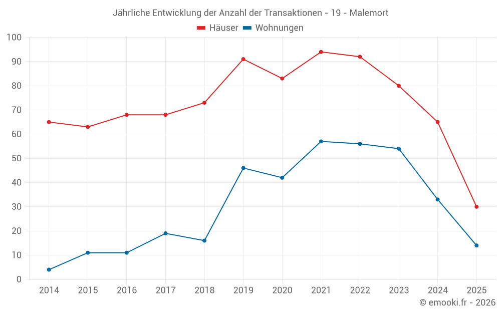 Der Durchschnittspreis auf den 31 Wohnungstransaktionen der letzten 12 Monate in der Gemeinde Malemort betrug 1 619 € pro Quadratmeter für einen mittleren Immobilienwert von 81 000 €. Über diesen Zeitraum hinweg lagen 60% der Transaktionen zwischen 1 438 und 1 958 € pro Quadratmeter (vom 2. bis zum 8. Dezil).