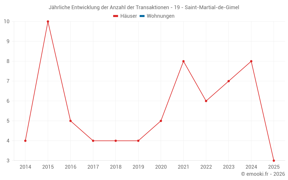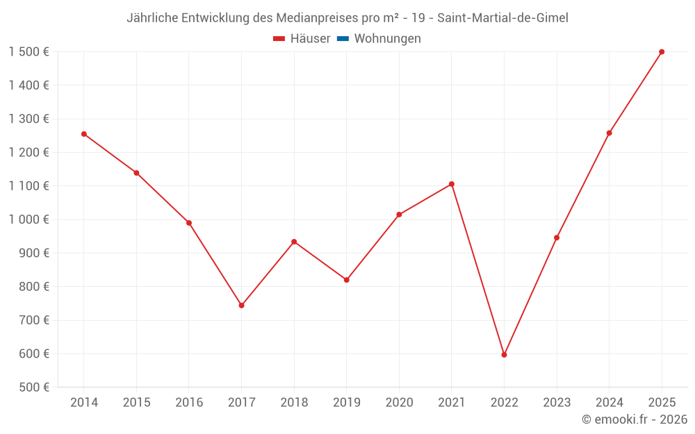 Der Durchschnittspreis auf den 15 Hausgeschäften der letzten 24 Monate in der Gemeinde Saint-Martial-de-Gimel betrug 1 182 € pro Quadratmeter für einen mittleren Immobilienwert von 106 000 €. Über diesen Zeitraum hinweg lagen 60% der Transaktionen zwischen 813 und 1 494 € pro Quadratmeter (vom 2. bis zum 8. Dezil).