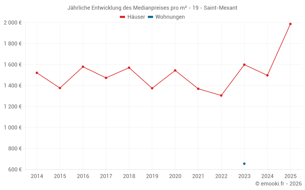 Der Durchschnittspreis auf den 24 Hausgeschäften der letzten 24 Monate in der Gemeinde Saint-Mexant betrug 1 642 € pro Quadratmeter für einen mittleren Immobilienwert von 145 780 €. Über diesen Zeitraum hinweg lagen 60% der Transaktionen zwischen 1 182 und 2 011 € pro Quadratmeter (vom 2. bis zum 8. Dezil).