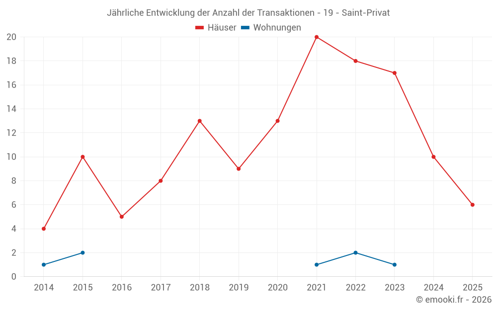 Der Durchschnittspreis auf den 26 Hausgeschäften der letzten 24 Monate in der Gemeinde Saint-Privat betrug 1 089 € pro Quadratmeter für einen mittleren Immobilienwert von 98 275 €. Über diesen Zeitraum hinweg lagen 60% der Transaktionen zwischen 817 und 1 573 € pro Quadratmeter (vom 2. bis zum 8. Dezil).