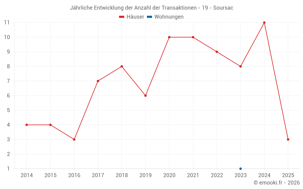 Der Durchschnittspreis auf den 17 Hausgeschäften der letzten 24 Monate in der Gemeinde Soursac betrug 987 € pro Quadratmeter für einen mittleren Immobilienwert von 60 000 €. Über diesen Zeitraum hinweg lagen 60% der Transaktionen zwischen 500 und 1 413 € pro Quadratmeter (vom 2. bis zum 8. Dezil).