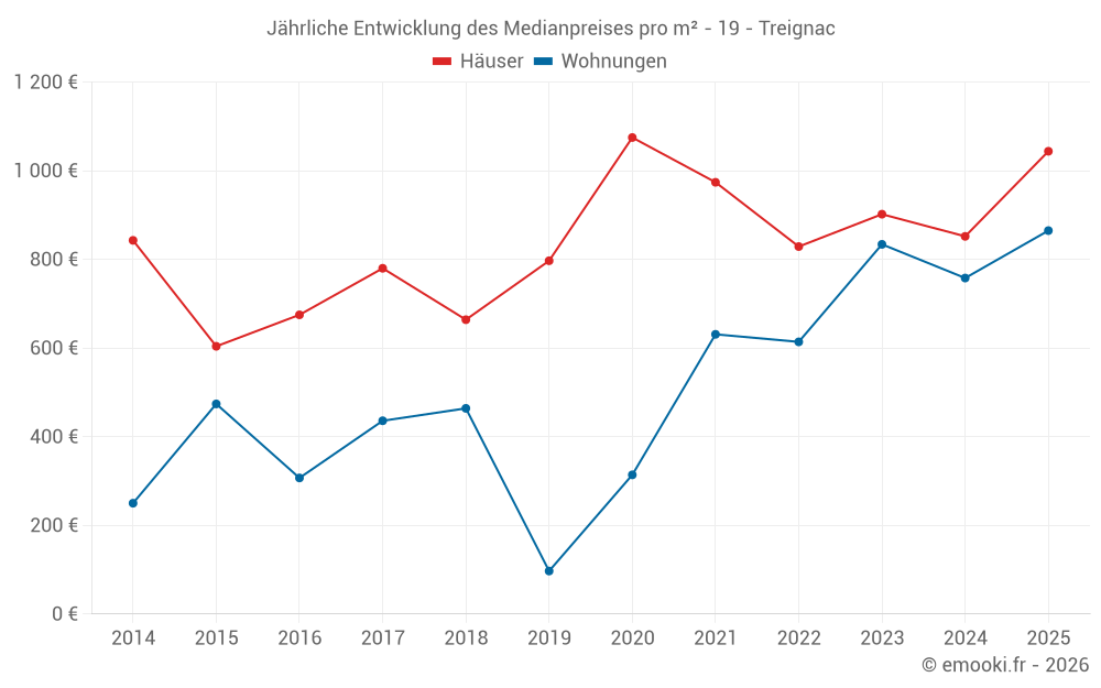 Der Durchschnittspreis auf den 23 Hausgeschäften der letzten 12 Monate in der Gemeinde Treignac betrug 1 000 € pro Quadratmeter für einen mittleren Immobilienwert von 88 500 €. Über diesen Zeitraum hinweg lagen 60% der Transaktionen zwischen 549 und 1 442 € pro Quadratmeter (vom 2. bis zum 8. Dezil).