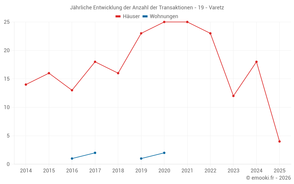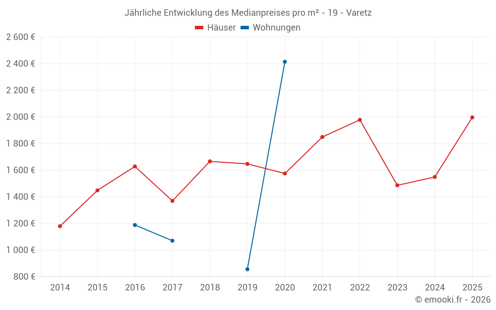 Der Durchschnittspreis auf den 19 Hausgeschäften der letzten 12 Monate in der Gemeinde Varetz betrug 1 935 € pro Quadratmeter für einen mittleren Immobilienwert von 157 000 €. Über diesen Zeitraum hinweg lagen 60% der Transaktionen zwischen 1 296 und 2 512 € pro Quadratmeter (vom 2. bis zum 8. Dezil).