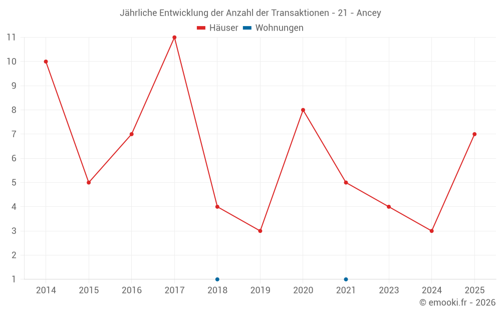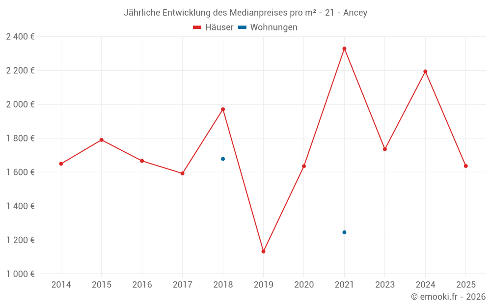 Der Preis pro m² von Häusern ist seit 4 Jahren um 30% gesunken, aber er ist in 8 Jahren um 2.8% gestiegen.